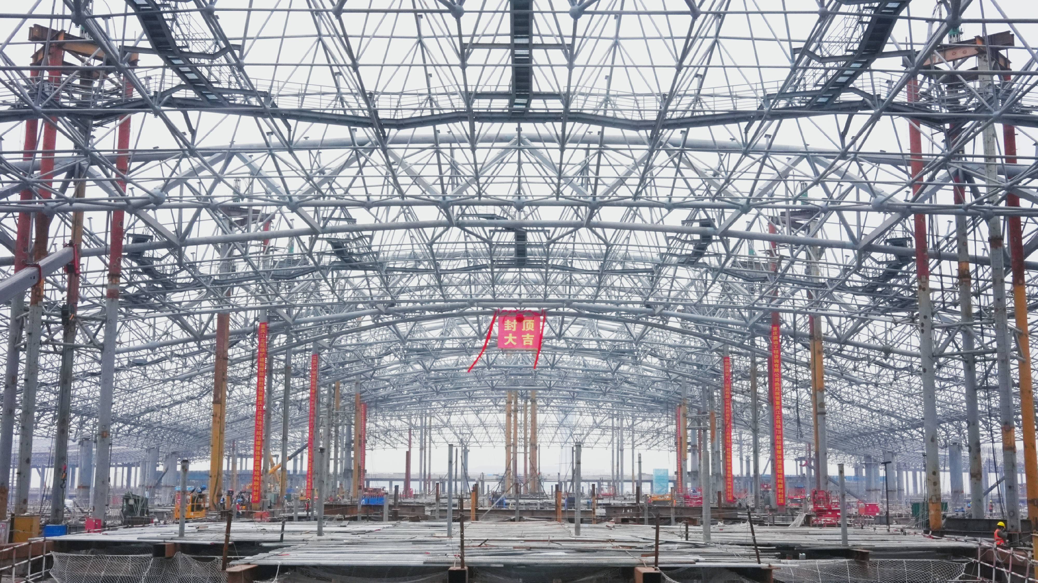 該項目屋蓋鋼結構為異形三維曲面造型焊接球網架,由12道陡坡狀天窗桁架分隔成13個立面單元,投影面積共約12.5萬平方米,最大跨度90米,最大結構高差達18米。曲面造型復雜、褶皺造型位置結構高差大、桿件數(shù)量多、施工難度大。施工人員將整個大廳屋蓋鋼結構分成11個區(qū)域,采用“樓面原位拼裝、分區(qū)分步提升、全程健康監(jiān)測”的安裝方法,總結形成了“基于BIM(建筑信息模型)的鋼結構一站式全周期管理技術研究與應用”,達到國際先進水平。