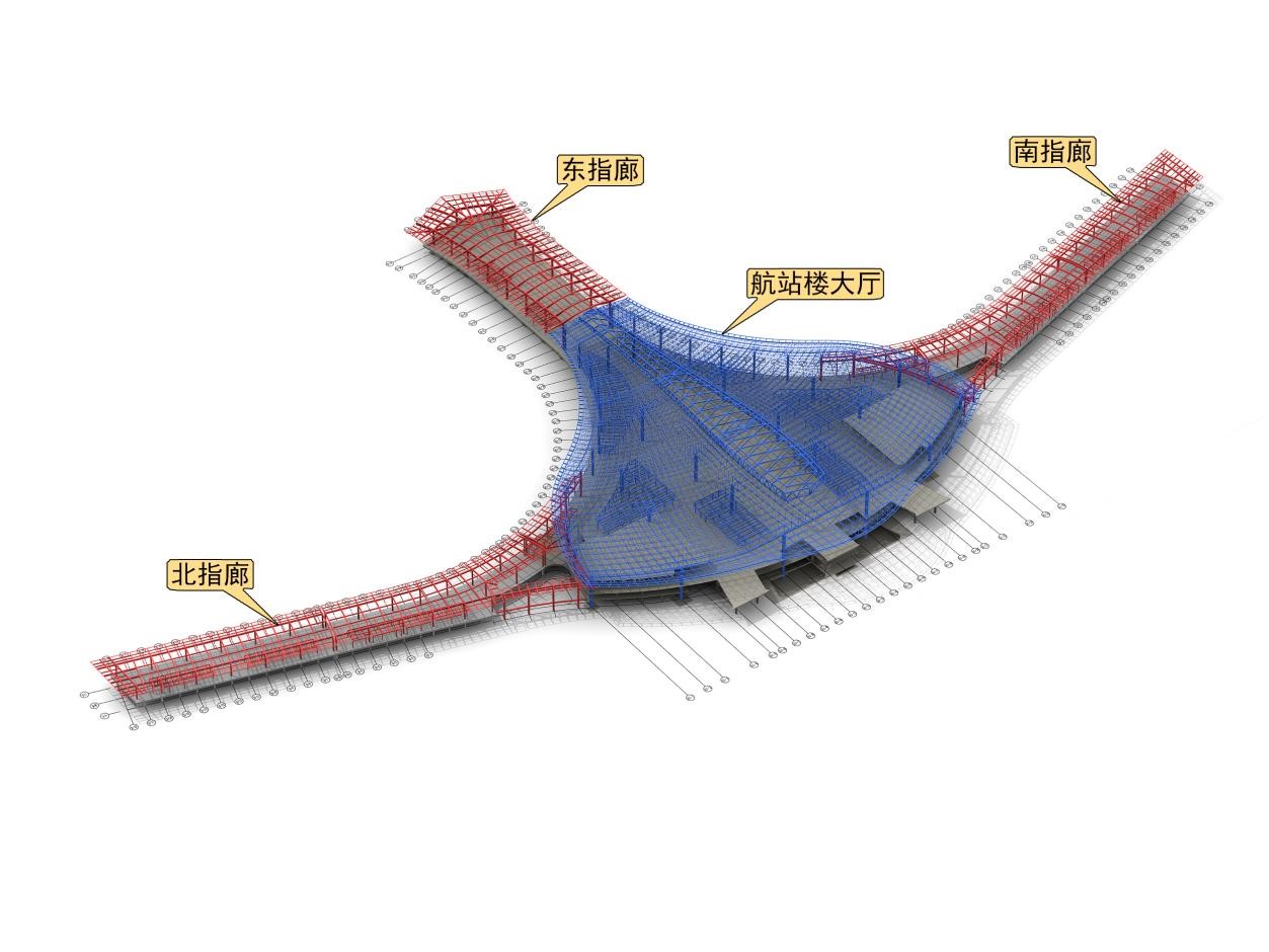 項(xiàng)目鋼結(jié)構(gòu)分為航站樓大廳、南北指廊和東指廊等地上及地下結(jié)構(gòu),用鋼量約8300噸。