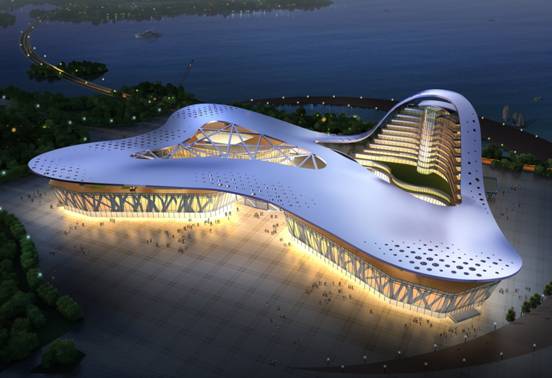 主場館中A展館、B展館為2層混凝土結構,建筑標高18.5米;C展館為3層混凝土結構,建筑標高23.5米,局部有出屋面樓梯間;酒店為15層框架-抗震墻結構,建筑標高61.5米。主場館上部設置鋁格柵造型飄帶,將場館與酒店連接成一個整體,俯視如一展翅蝴蝶,與主場館的花卉主題遙相呼應;飄帶的支撐采用樹狀柱支撐形式,主場館整體造型如下所示。
