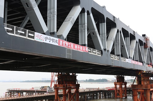 錢塘江新建大橋是滬杭甬高速公路杭州市區(qū)段改建工程節(jié)點(diǎn)控制性工程。大橋跨徑布置為(72+122+4×240+122+72)m,橋梁主跨為240m,全長1348m,是國內(nèi)首座多跨長聯(lián)公軌兩用懸鏈形上加勁鋼桁梁橋。全橋用鋼量約6.2萬噸,滬寧鋼機(jī)承擔(dān)約2.7萬噸的制作任務(wù)。