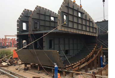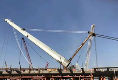 主橋橋型采用傾斜獨塔空間大角度雙索面吊桿空間斜主纜自錨式懸索橋,橋梁總長420m,跨度為86+93+155+86m。主橋共有一個橋塔,橋塔高出橋面約103m,全高107.5m(至梁底),立面傾斜角度22.8°。全橋用鋼量約1.1萬噸.
