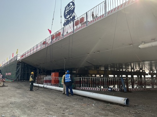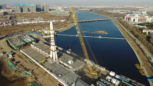 全橋長313m,標(biāo)準(zhǔn)段寬度39.5m,雙向六車道,線路等級(jí)為城市主干路。其中,主橋?yàn)?/span>2×90m鋼結(jié)構(gòu)獨(dú)塔二跨單索面斜拉橋,塔高48.6m,采用塔梁墩固結(jié)體系。